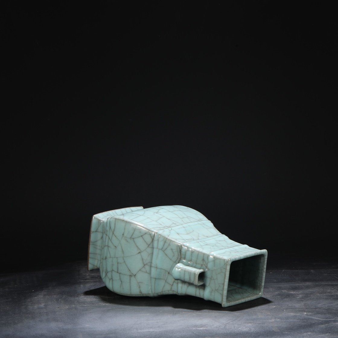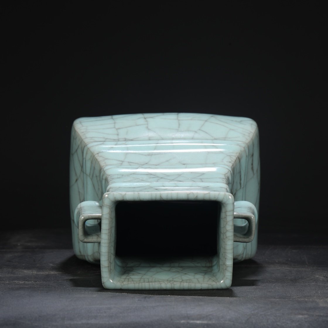An old Southern Song Dynasty imperial green-glazed square-shaped bottle with pierced ears, inscribed by Emperor Qianlong.